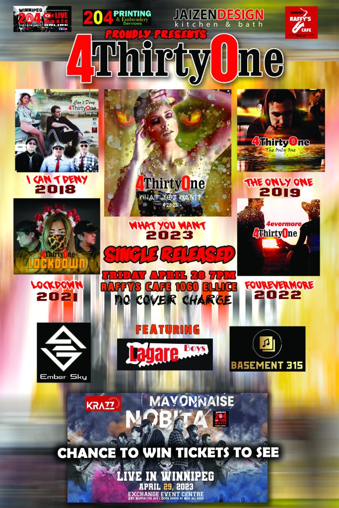 4ThirtyOne’s 5th Single Tittle “WHAT YOU WANT?” Live Single released at Raffy’s Cafe 1060 Ellice featuring Lagare Boyz and Ember Sky. This coming Friday 6pm April 28th, 2023.. Free event no cover charge!